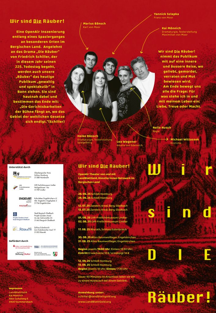 Vor zwei Jahren wurde die Theatergruppe LandBlattGold für ihr Open-Air-Projekt „Wir sind Faust!“ mit dem Kultur-Förderpreis des Oberbergischen Kreises ausgezeichnet. Nun kehrt LandBlattGold um Heike Bänsch, Kai Mönnich und Michael Wittassek mit einem weiteren deutschen Klassiker zurück. Nachdem bei der Premiere ihres Konzepts Goethes „Faust I“ als Grundlage diente, wählten sie nun Schillers „Die Räuber“ aus. Schon Ende des Monates – die Premiere steigt Samstag, 28. Juni, am Schloss Homburg – geht es los mit den Aufführungen für das Stück „Wir sind Die Räuber!“, das Darsteller und Publikum wieder gemeinsam an spannende Orte im Kreis und in Bergisch Gladbach führen wird – natürlich erneut unter freiem Himmel. Und wer möchte, kann LandBlattGold noch unter die Arme greifen. Es werden noch „Gute Geister“ für die Aufführungen gesucht.
